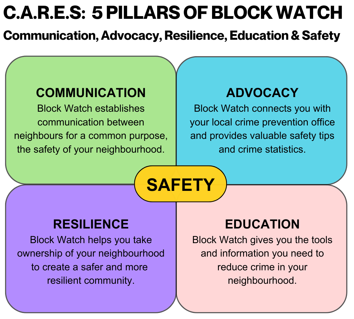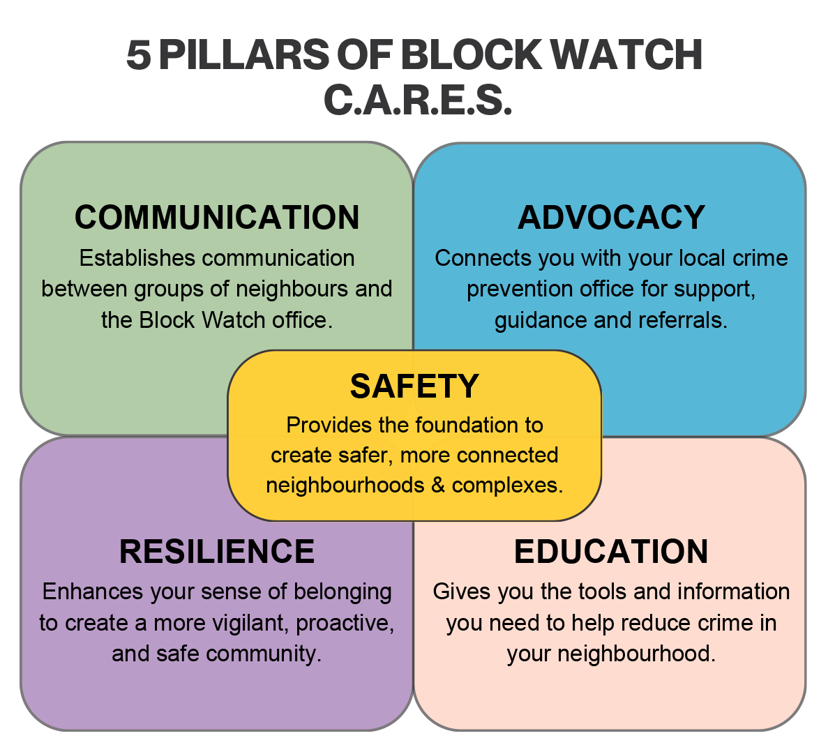 Block Watch is an inclusive, community-based program that connects people, builds relationships, and creates a strong sense of community. Participating in Block Watch involves being alert to your surroundings, talking to your neighbours, being aware of local crime trends and learning current crime prevention techniques from your local Block Watch office. When you see something suspicious or witness criminal activity you are asked to safely observe and report what you see to police and share the information with your Block Watch group. Groups can be set up in residential neighbourhoods and multi-family dwellings and complexes.
